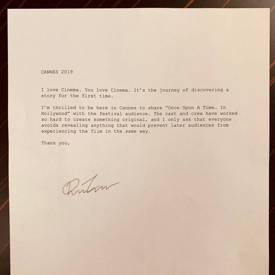 Net als de Russo brothers het deden voor de film Avengers Endgame roept nu ook Quentin Tarantino alle filmfans op geen spoilers te delen van zijn aankomende film Once Upon a Time in Hollywood. Onderstaande bericht deelde hij tijdens zijn bezoek aan Cannes...